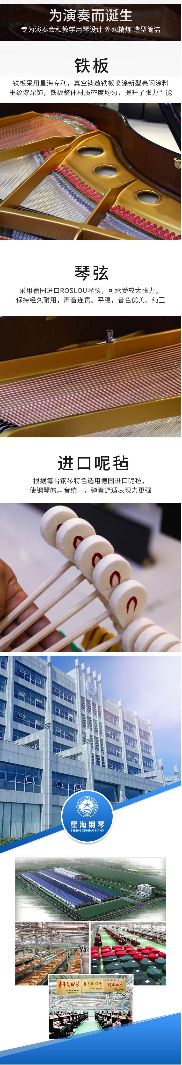 鐵  板:鋼板采用真空鑄造技術(shù),抗張力性能提高,其棱角清晰,表面細膩,噴涂了星海新型亮閃涂料,凸顯了金屬質(zhì)感,根據(jù)鋼琴發(fā)聲原理進行的結(jié)構(gòu)設(shè)計,提高了三個音區(qū)的協(xié)振性能。